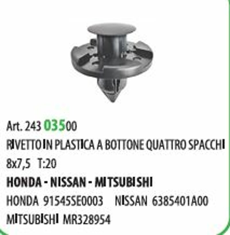Questo rivetto in plastica è un ricambio professionale indispensabile, progettato per il fissaggio di una vasta gamma di componenti su veicoli Honda, Nissan, Mitsubishi e Renault. Con il codice OEM 0155309321, offre una compatibilità garantita e una tenuta sicura per parafanghi, paraurti, rivestimenti e pannelli di vario tipo.